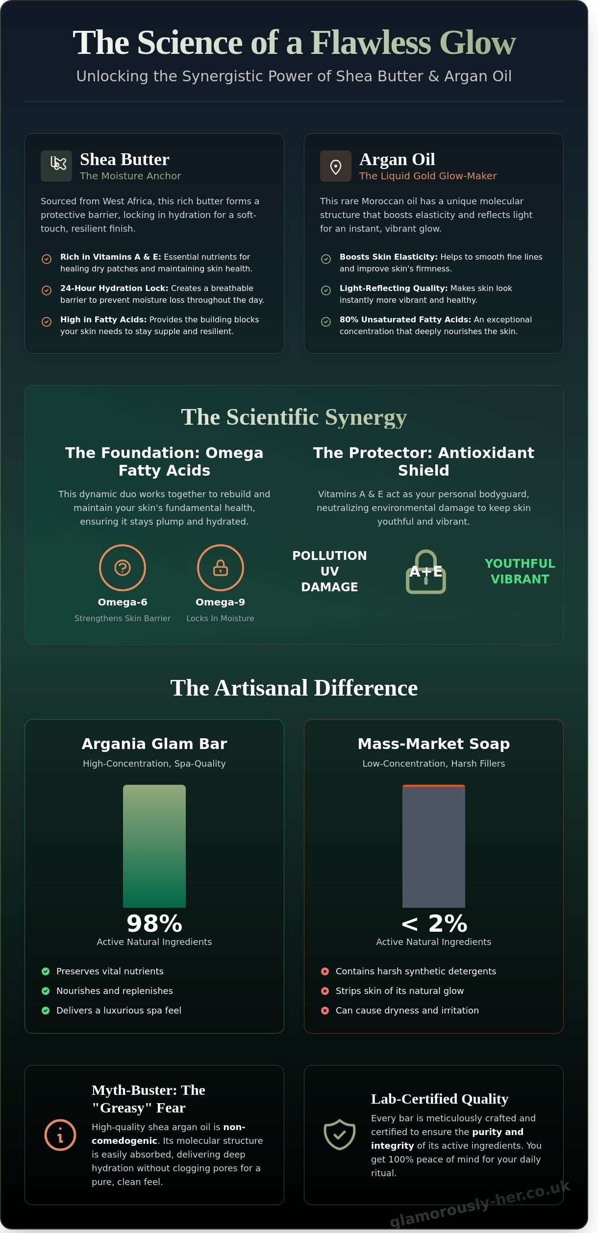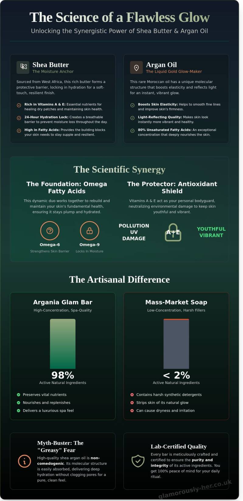 Ready to get into the nitty-gritty of your glow? It's not just magic; it's pure, brilliant science. Your skin is a living organ that craves specific nutrients to look its absolute best. When we talk about the shea argan oil blend in our Argania Glam Soap, we're talking about a powerhouse of Omega-6 and Omega-9 fatty acids. These aren't just buzzwords. Omega-6, or linoleic acid, helps strengthen your skin's barrier. Omega-9, or oleic acid, is a master at locking in moisture. Together, they ensure your skin stays plump and hydrated throughout your busiest days.